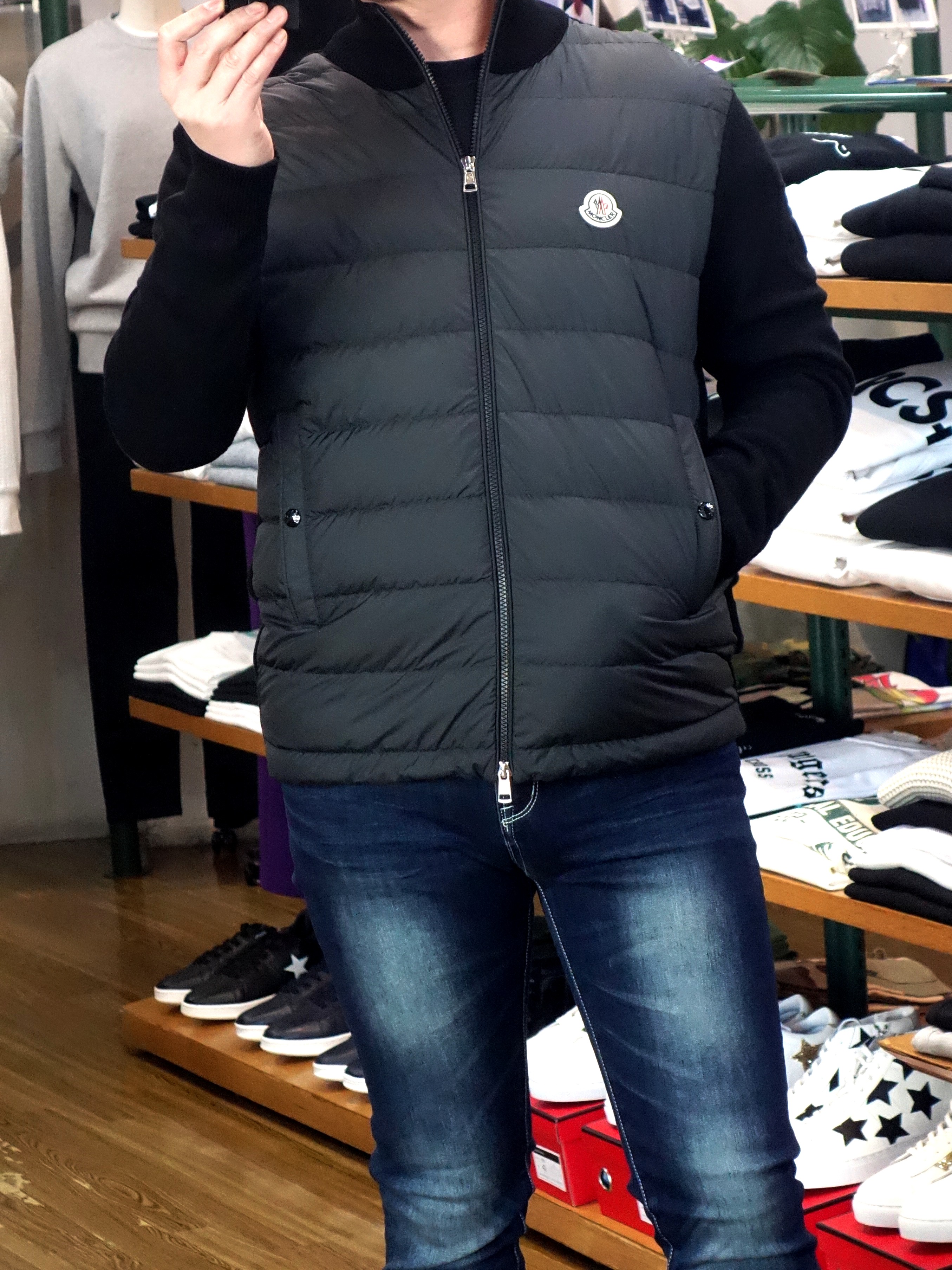 ★モンクレールのコットンニットのハイブリッドジャケットで、袖の型押しロゴがかっこよすぎるモデルをアップしました ★定価¥179300(税込)から20%OFFで¥143440(税込)です ★【2026年春モデルです】